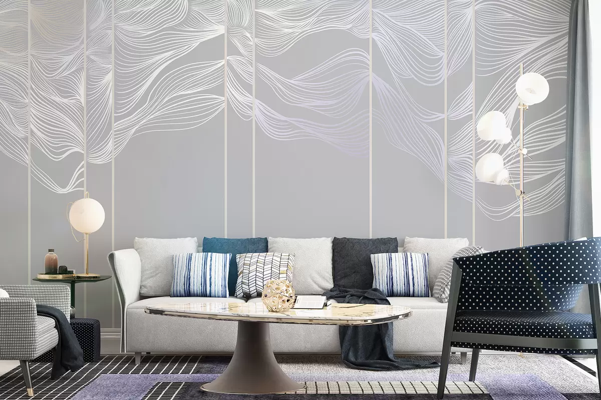 Fotobehang Vloeiende witte abstracte lijngolven tegen een lichtgrijze achtergrond N° w08263v1