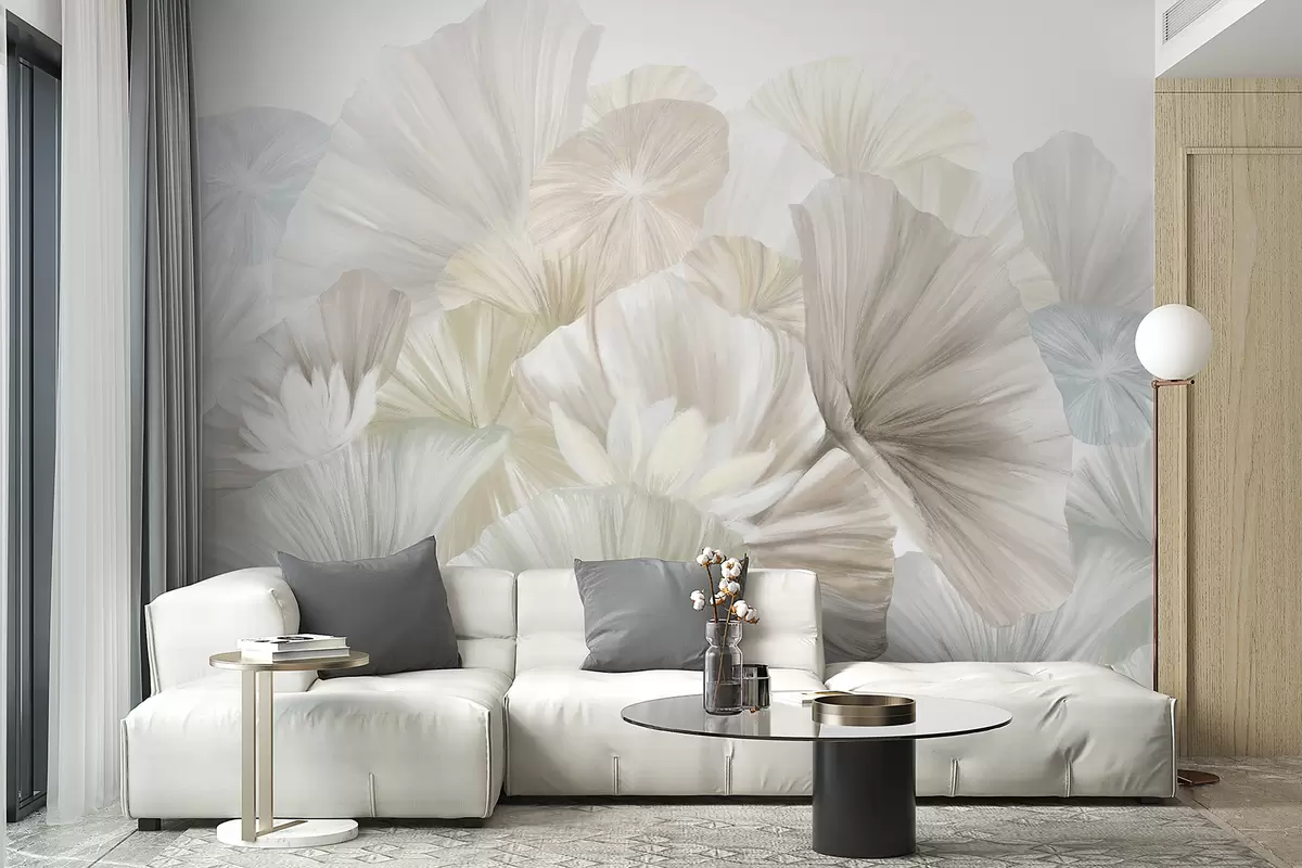 Fotobehang Delicate groene lotusbladeren met witte bloemen met zachte, vederlichte bloemblaadjes gerangschikt in een natuurlijke kunstcompositie N° w08265