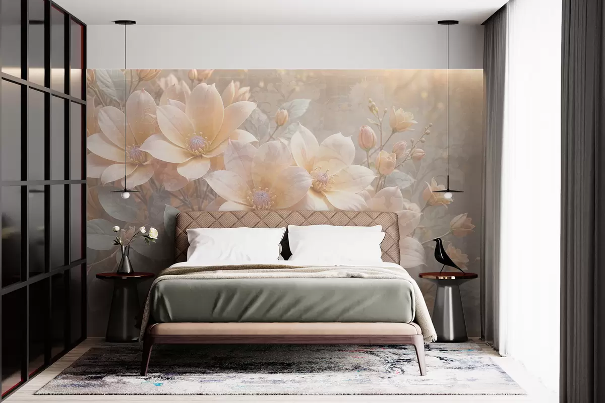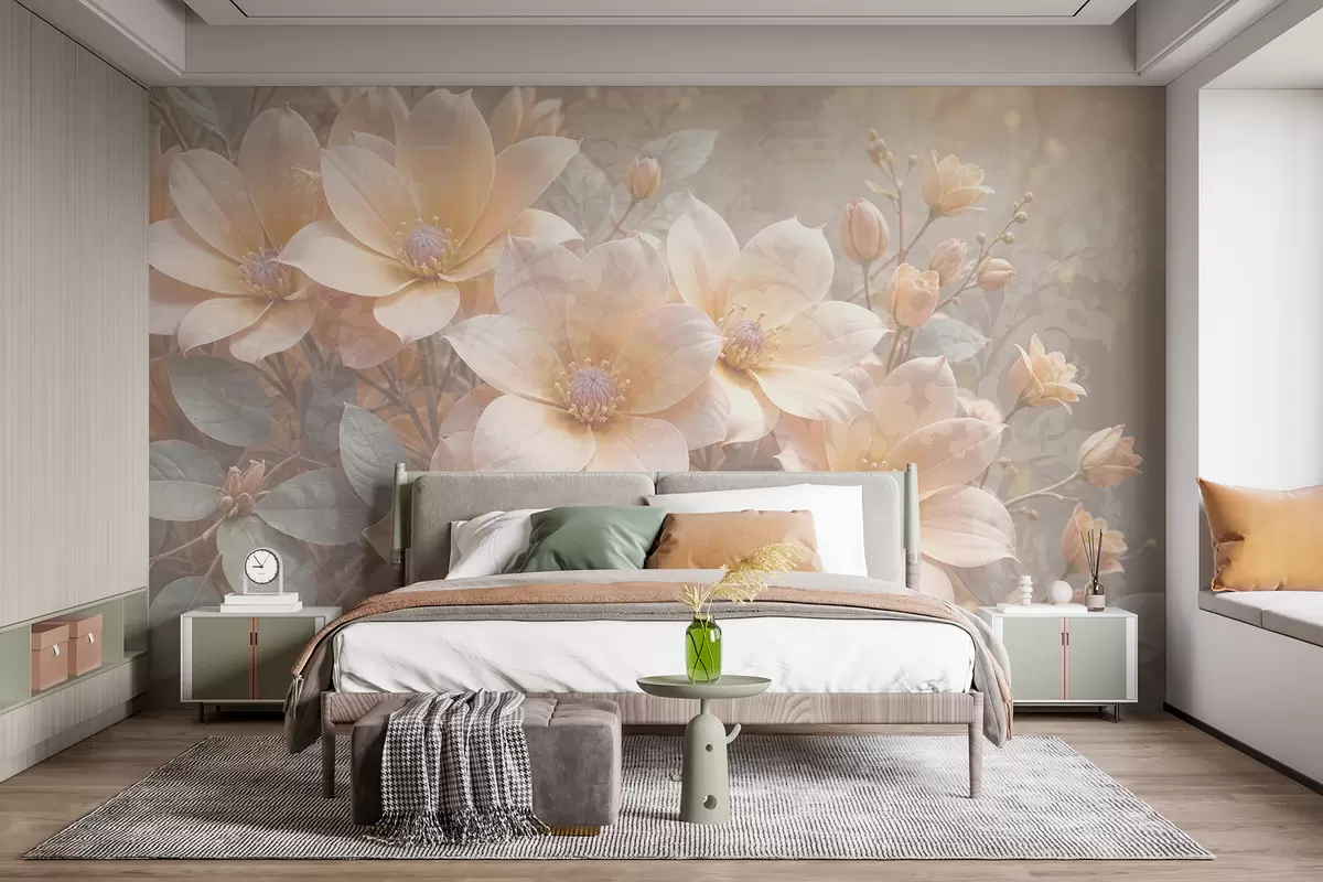 Fotobehang Pastelkleurige bloemen met fijne bloemblaadjes tegen een vage achtergrond met textuur, die een serene sfeer creëert N° w08273