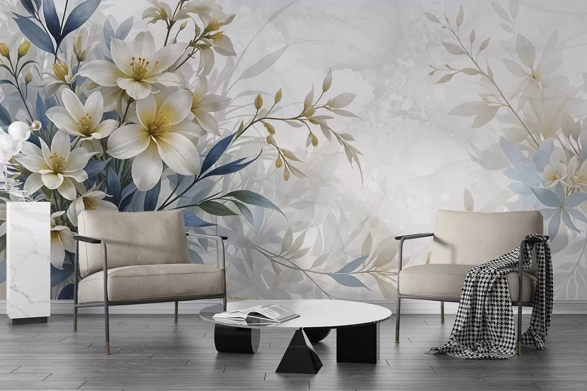 Fotobehang Wit, beige en blauw bloemenboeket met fijne blaadjes op een zachte, onscherpe achtergrond N° w08314