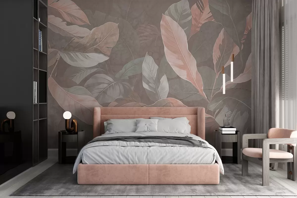 Fotobehang Abstracte print met witte, beige en perzikkleurige delicate bladeren op een zachte, zachte textuurachtergrond N° w08322v1