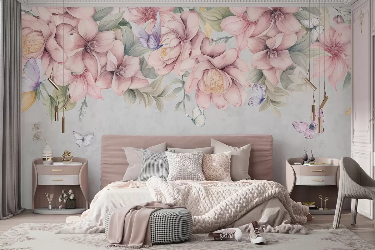Fotobehang Zachtroze en witte bloemen met tere bloemetjes en blaadjes op gestructureerde grijze achtergrond N° w08331