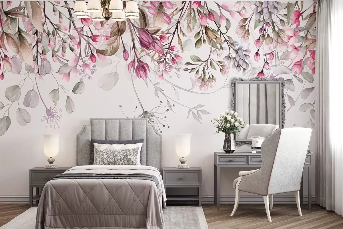 Fotobehang Delicate roze en witte bloesemtakken met bladeren en bloemblaadjes, op pastelgrijze achtergrond N° w08347