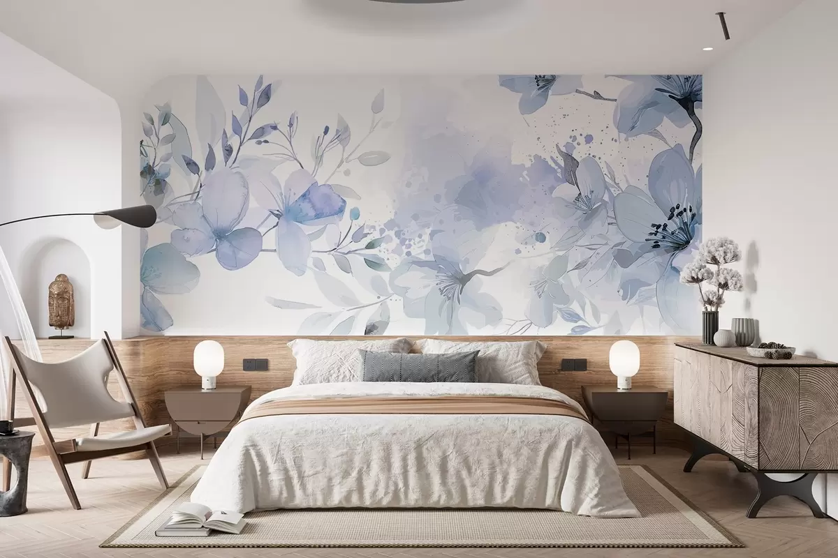 Fotobehang Een boeket delicate blauwe en witte bloemen met zachte, onscherpe bloemblaadjes tegen een lichte, luchtige aquarelachtergrond N° w08348v1