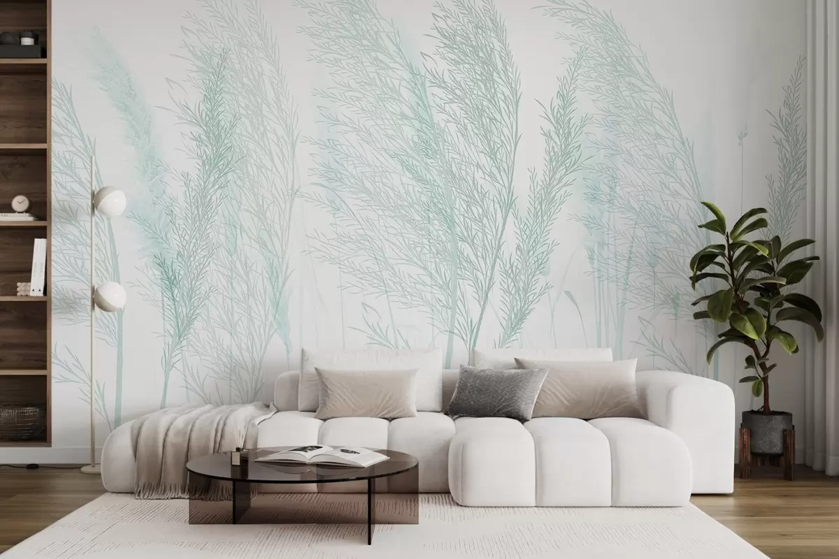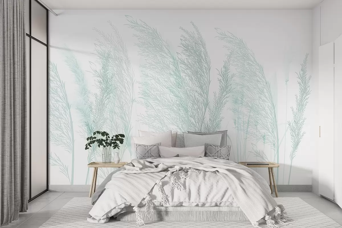Fotobehang Delicaat pastelturquoise zacht pampagras tegen een witte achtergrond minimalistische compositie N° w08351v2