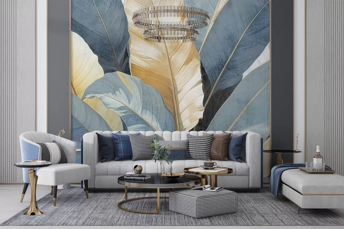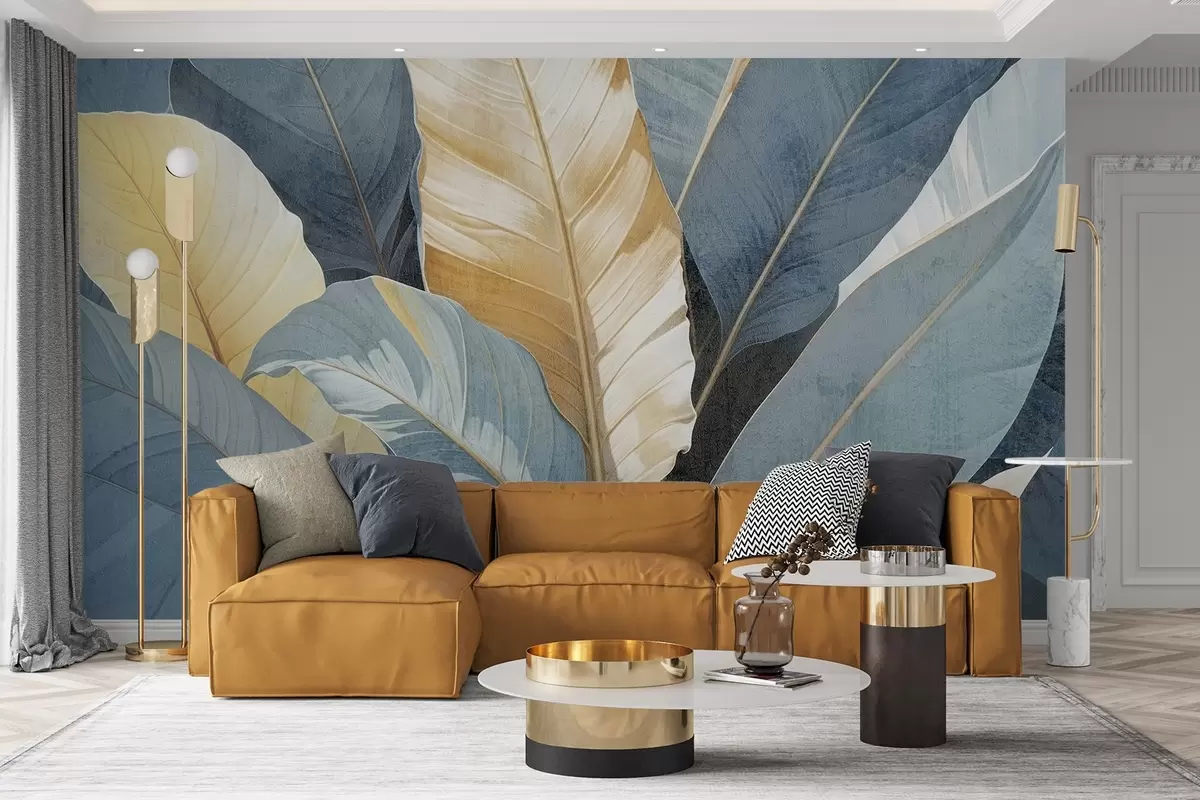Fotobehang Een close-up van grote weelderige decoratieve tropische bladeren in blauw-, groen- en geeltinten N° w08373