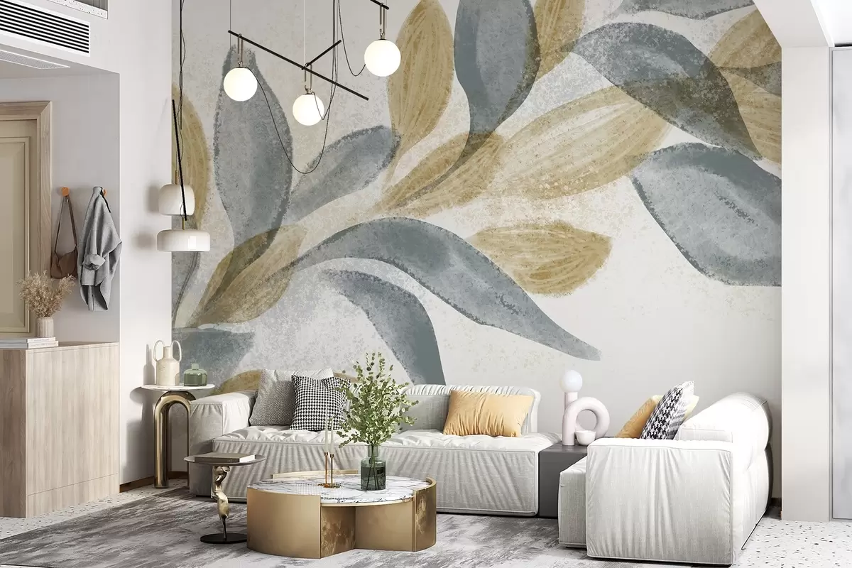 Fotobehang Beige en blauwe bladeren met pasteltextuur, zachte randen en spetters tegen een lichte achtergrond N° w08374