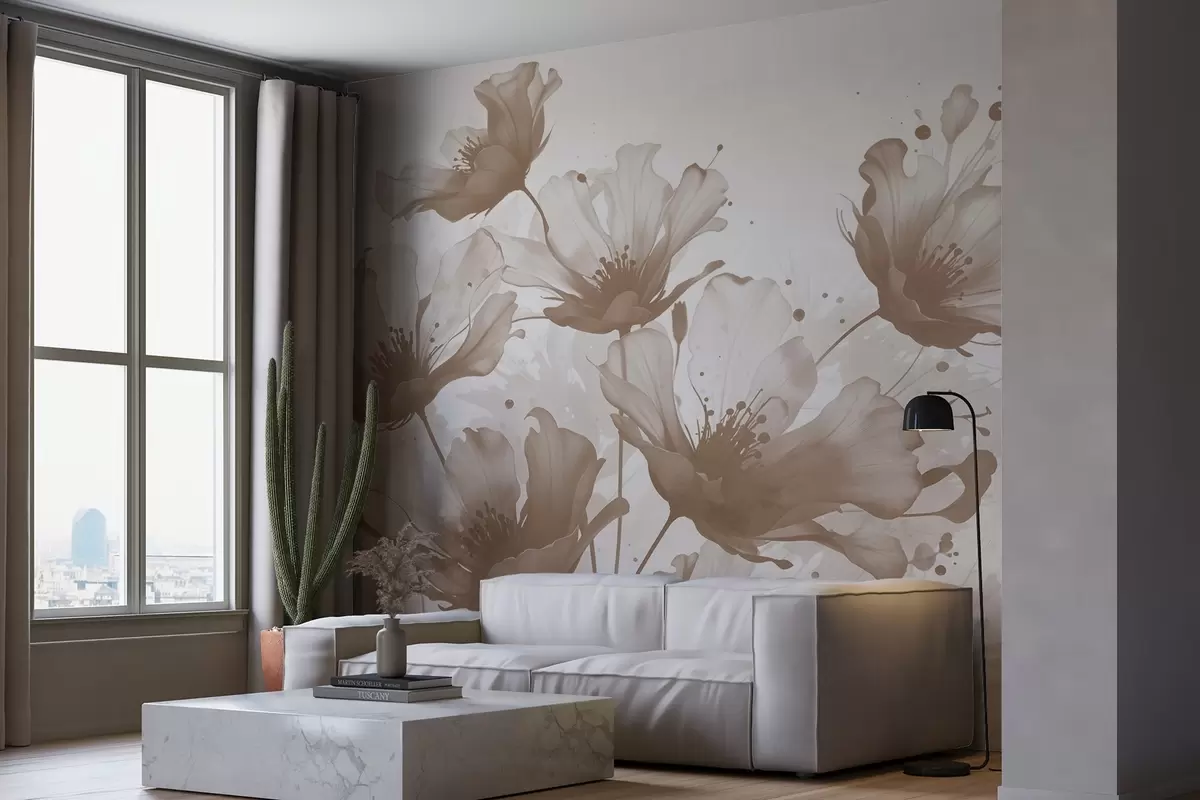 Fotobehang Delicate bruine bloemen met zachte, onscherpe bloemblaadjes en waterverfspatten tegen een lichte achtergrond N° w08376v1