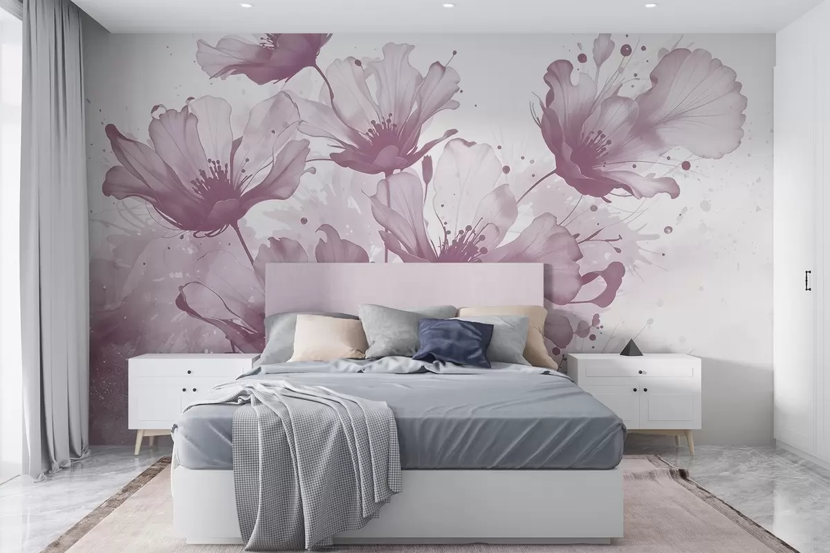 Fotobehang Delicate roze bloemen met zachte, onscherpe bloemblaadjes en waterverfspatten tegen een lichte achtergrond N° w08376v2