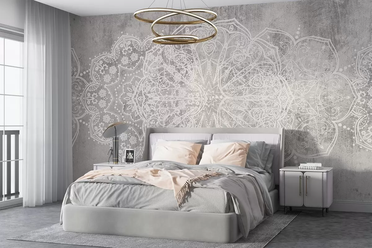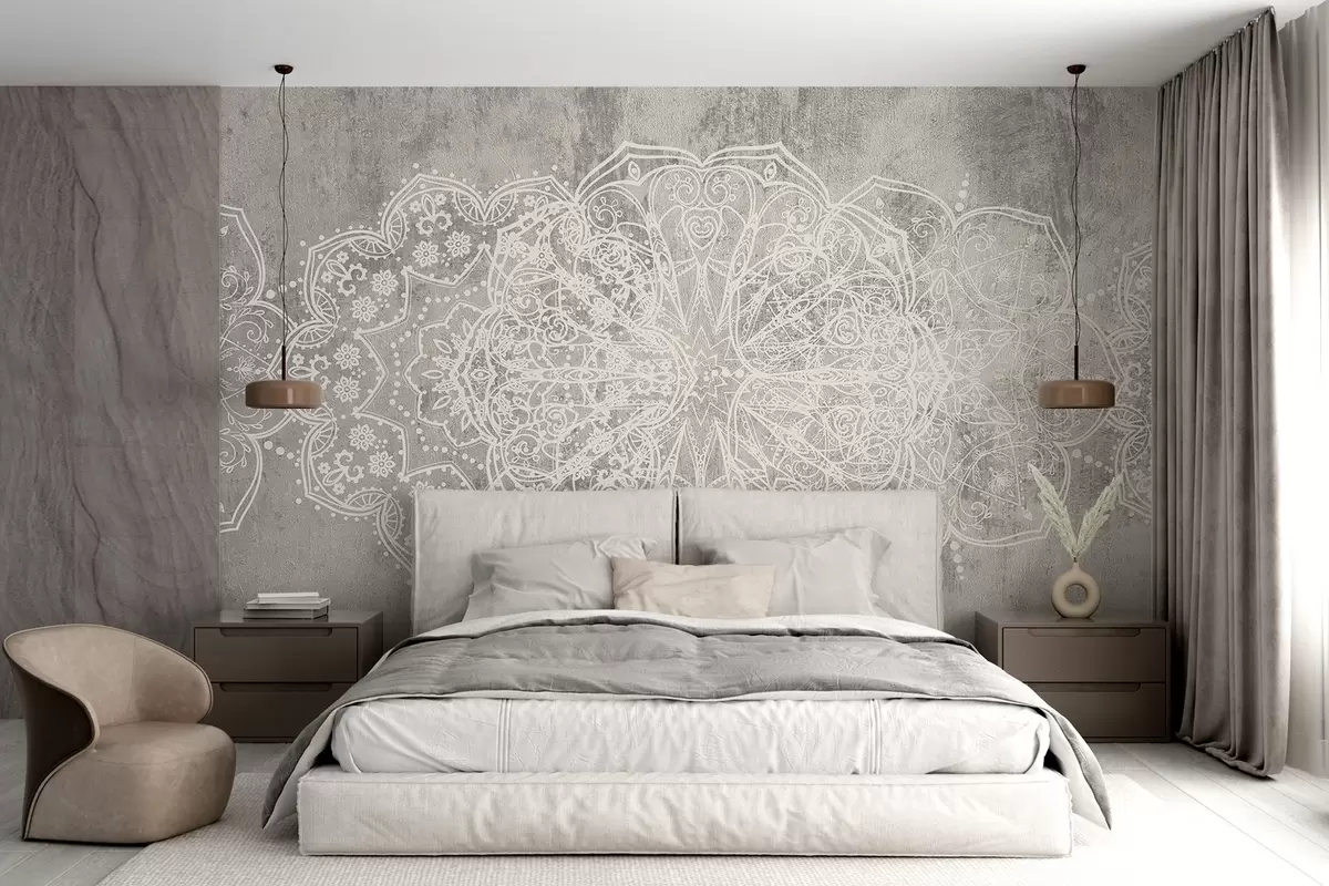 Fotobehang Een gedetailleerd, ingewikkeld wit kanten mandalapatroon op een getextureerde loftgrijze muurachtergrond N° w08387