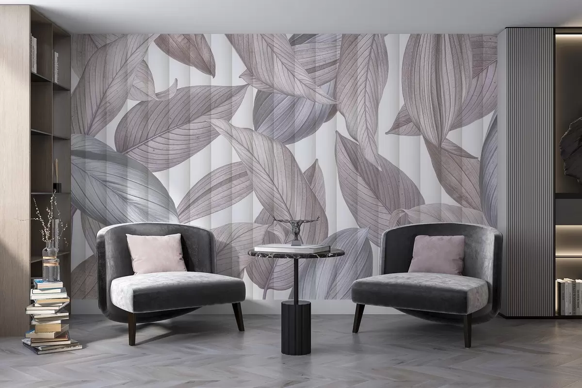 Fotobehang Abstracte gedetailleerde bladeren in tinten blauw, grijs en pastelroze op een lichte achtergrond N° w08388v1