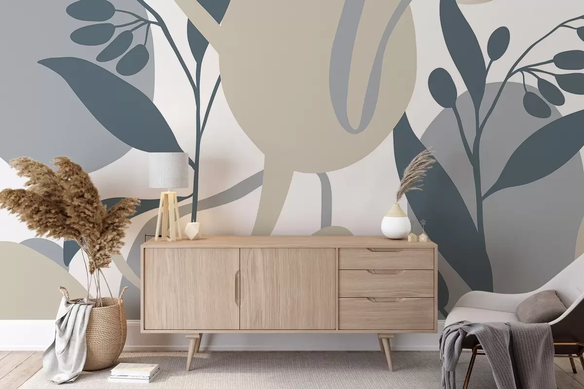 Fotobehang Een minimalistische abstracte bloemenprint met beige en grijze vormen tegen een witte achtergrond N° w08400