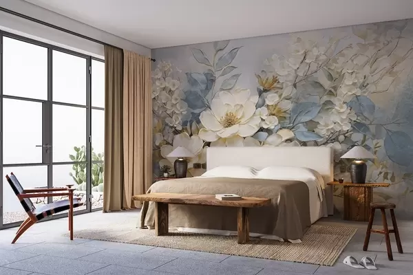 Fotobehang Gestructureerde grote witte en lichtgele bloemen met grijsgroene bladeren tegen een zachte, onscherpe achtergrond N° w08404