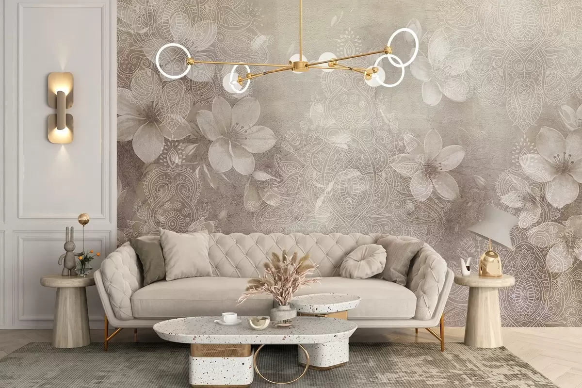 Fotobehang Zachte focus tekening van delicate witte bloemen op een wazige beige achtergrond met textuur N° w08405v1