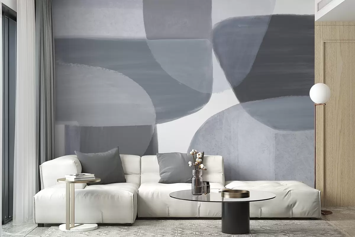 Fotobehang Een monochrome abstracte print met overlappende minimalistische vormen in grijs- en blauwtinten N° w08410