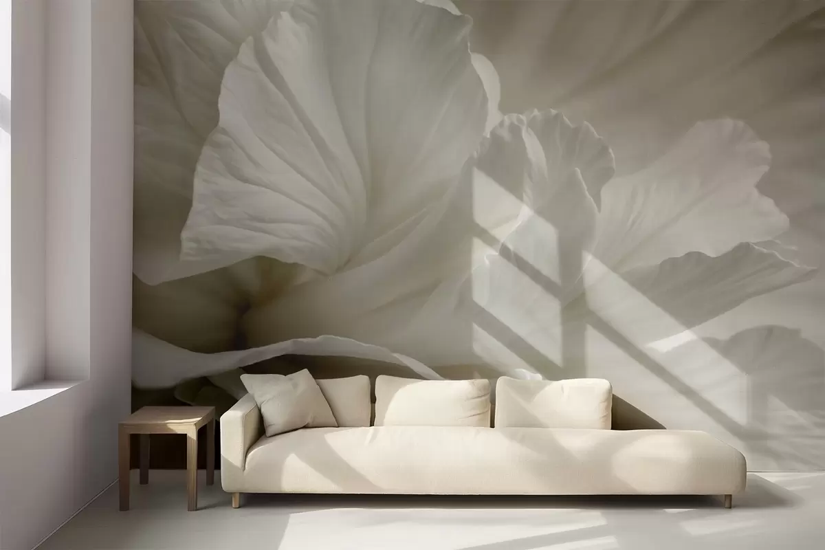 Fotobehang Abstracte minimalistische print van delicate witte bloem met zachte, fluweelachtige bloemblaadjes N° w08424