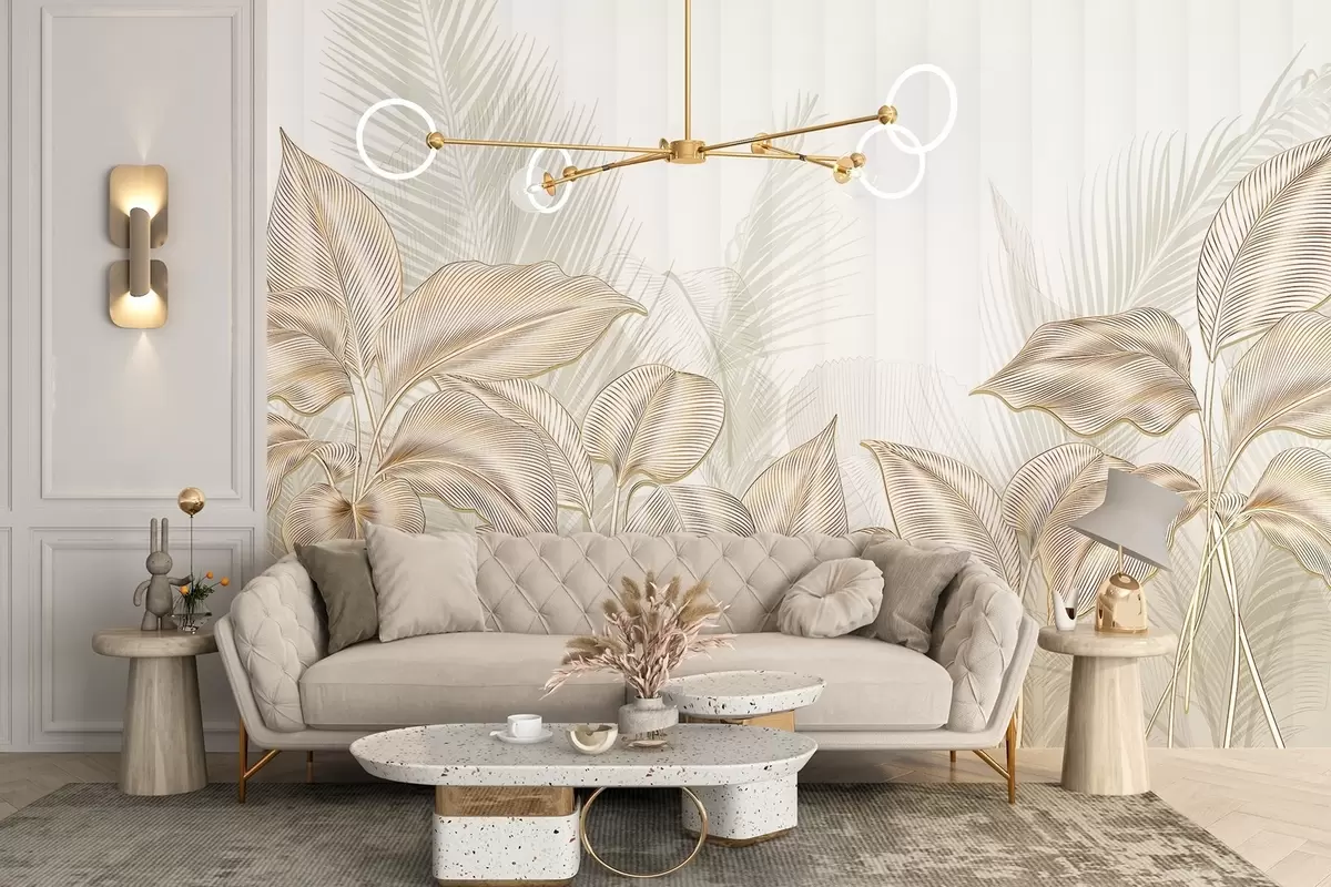 Fotobehang Elegante witte en beige palmbladeren tegen een lichte achtergrond met textuur N° w08434