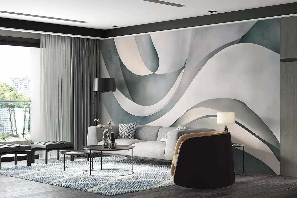 Fotobehang Witte, blauwe en grijze gebogen vormen die een abstracte, texturale, moderne en minimalistische print creëren N° w08439v1
