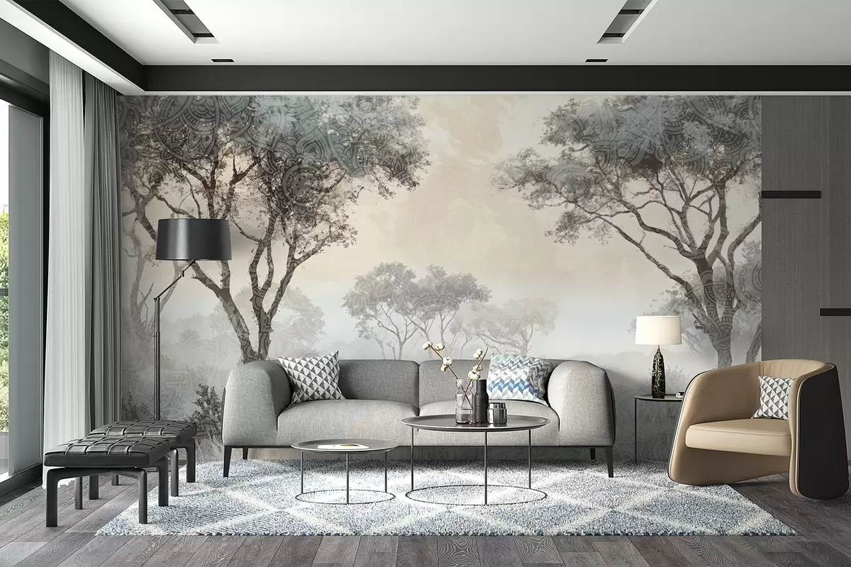 Fotobehang Een mistig, sereen landschap met silhouetten van bomen op de voorgrond met zachte mist in grijs- en beigetinten N° w08442v1