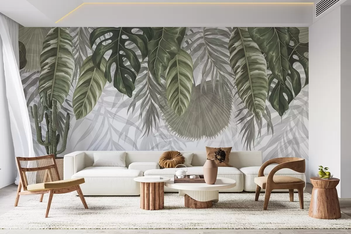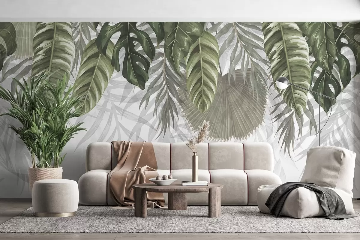 Fotobehang Tropische bladeren in groene tinten, waaronder grote monsterabladeren en palmbladeren op witte achtergrond N° w08443