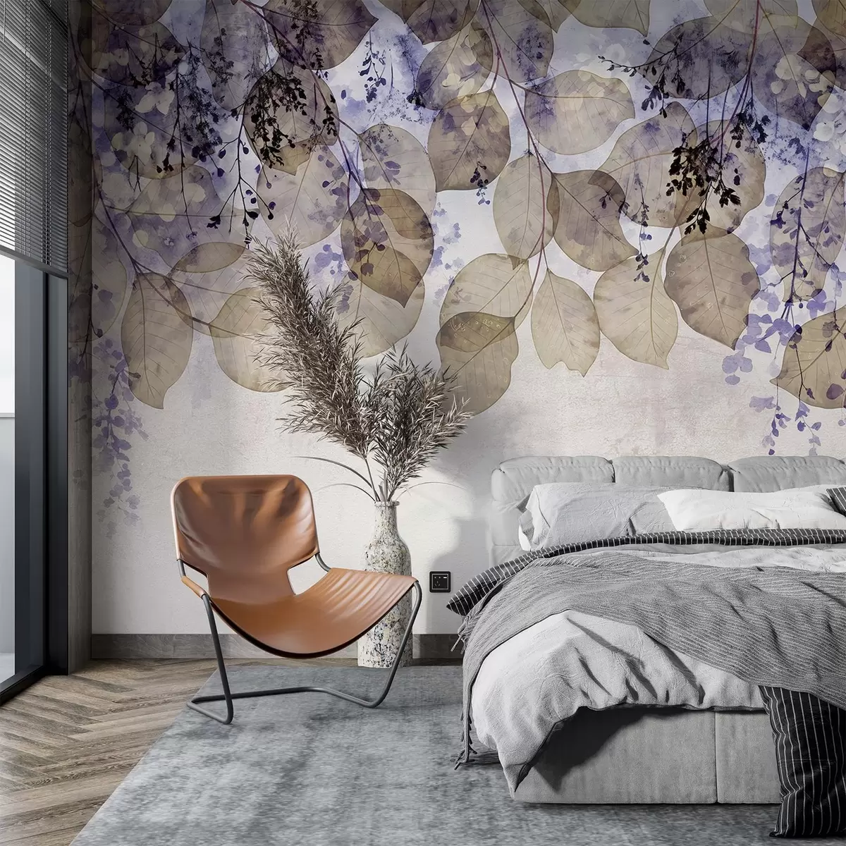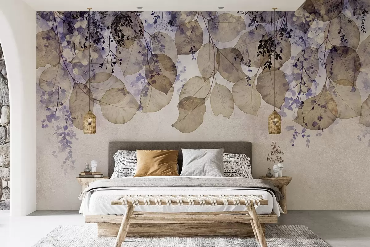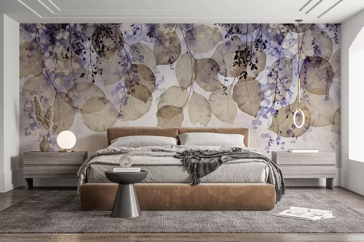 Fotobehang Delicate gedroogde bladeren en bloemen in paarse, beige en witte tinten tegen een lichte textuurachtergrond N° w08447