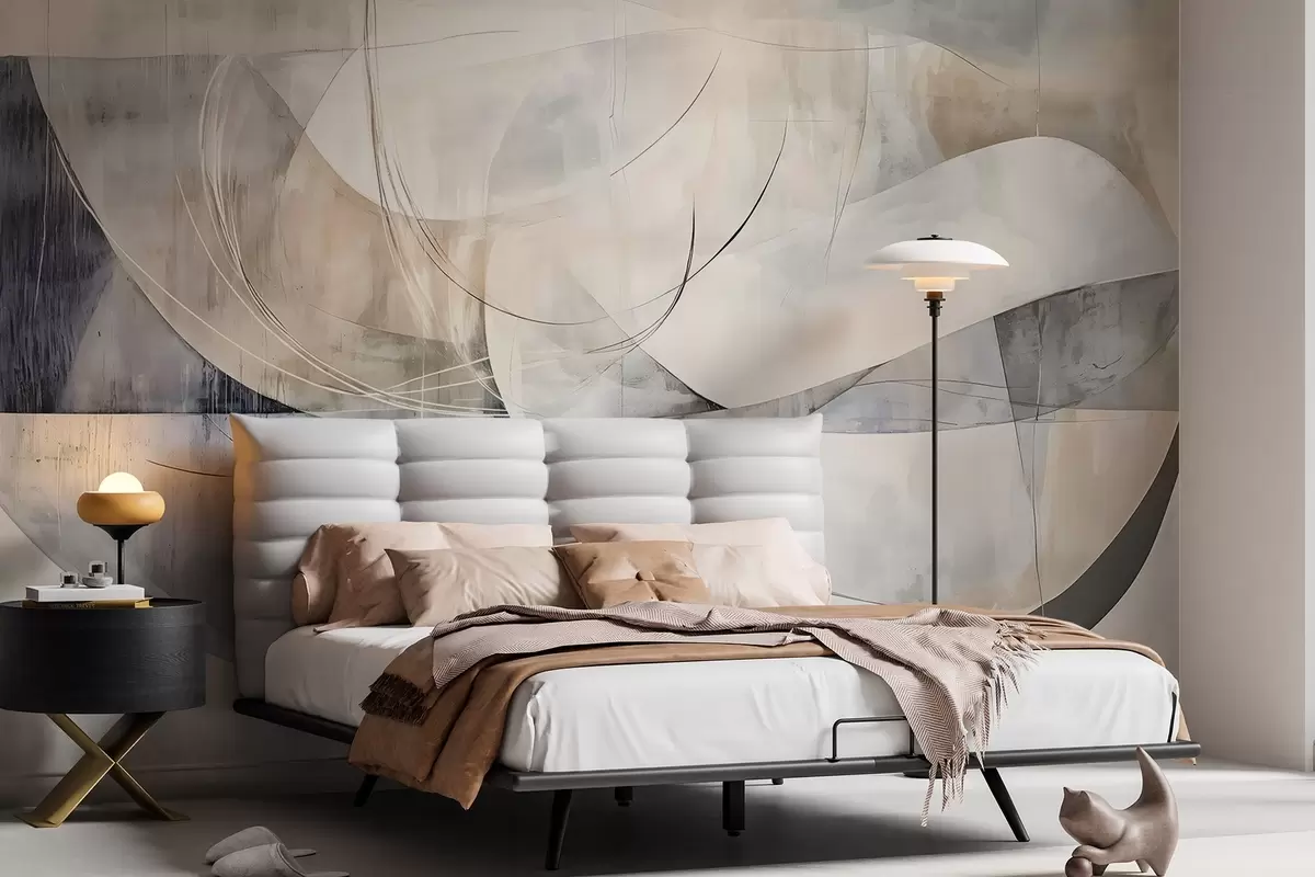 Fotobehang Abstracte vormen in wit, grijs, beige en blauw tegen een vage achtergrond met textuur N° w08461