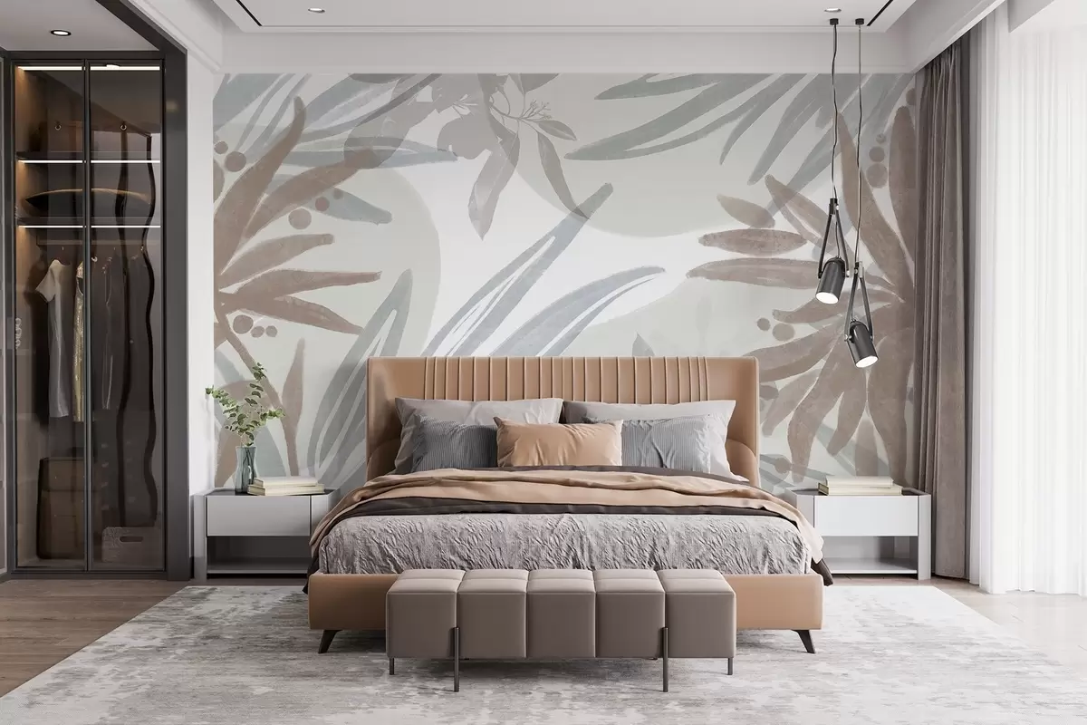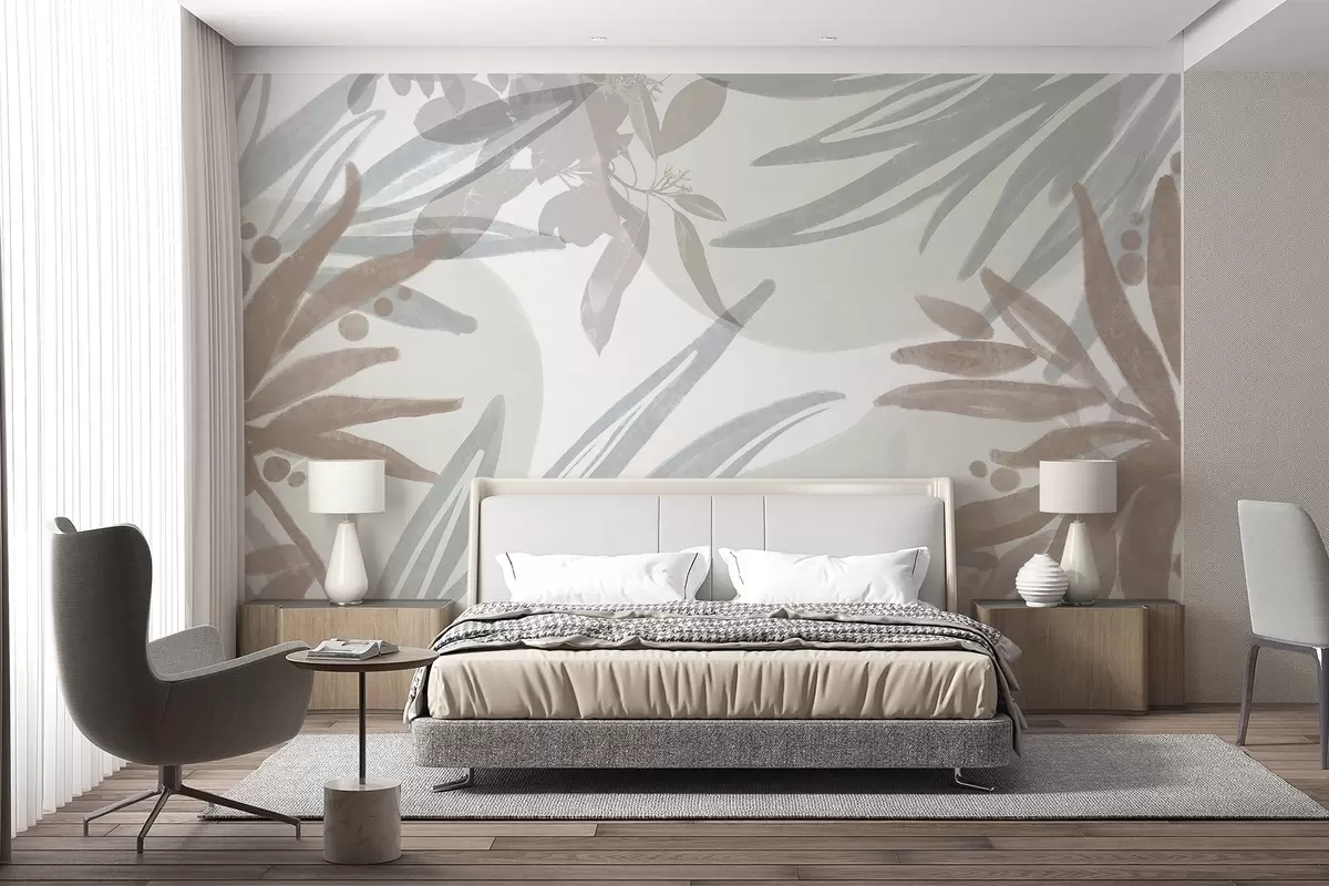 Fotobehang Een neutraal abstract bloemenpatroon met overlappende bladeren en vormen in grijstinten, wit en beige N° w08464