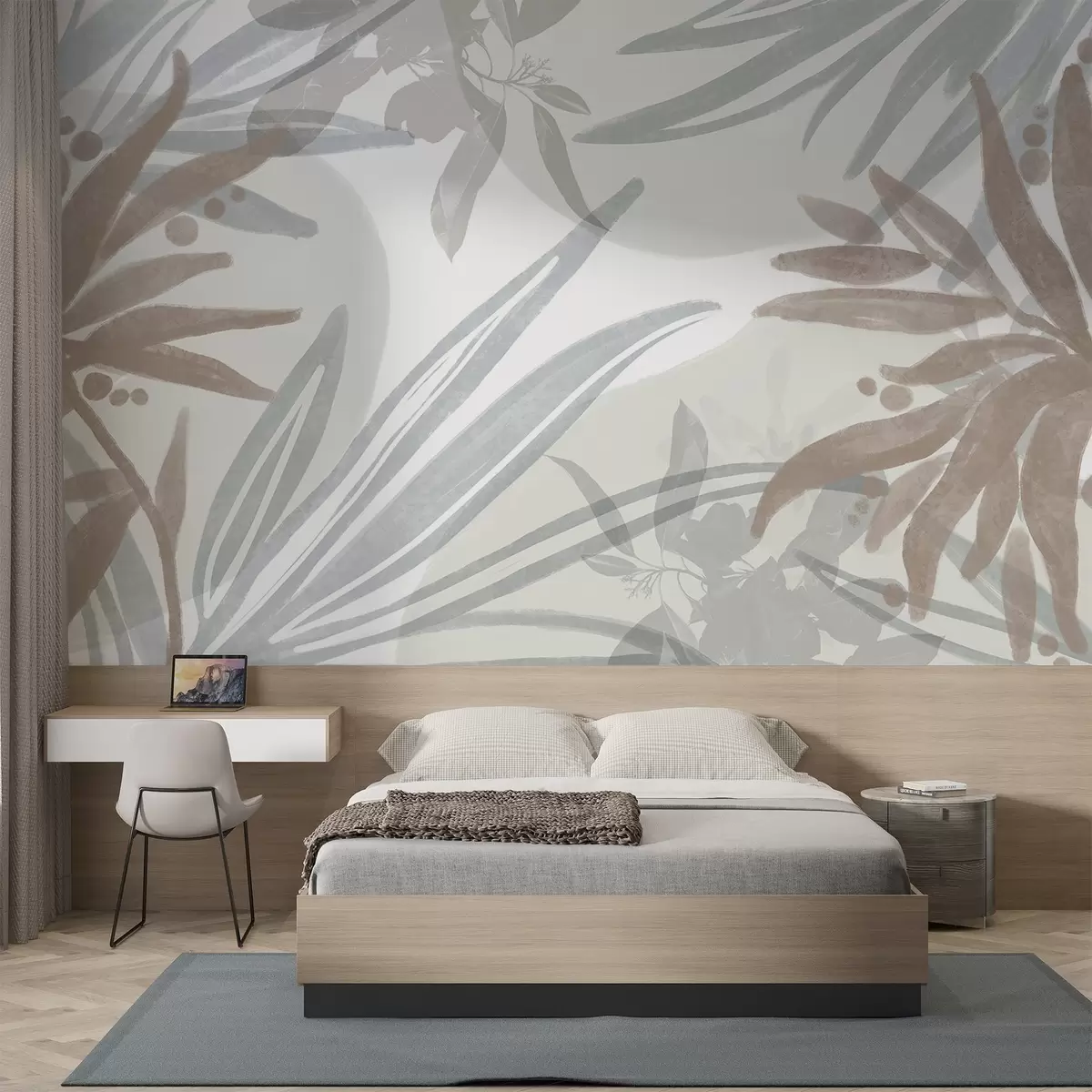 Fotobehang Een neutraal abstract bloemenpatroon met overlappende bladeren en vormen in grijstinten, wit en beige N° w08464
