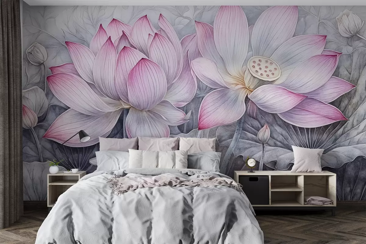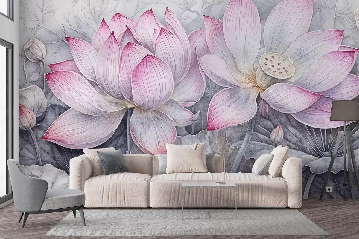 Fotobehang Verschillende gedetailleerde getextureerde grote roze lotusbloemen met grijsgroene bladeren en stengels tegen een lichte achtergrond N° w08465