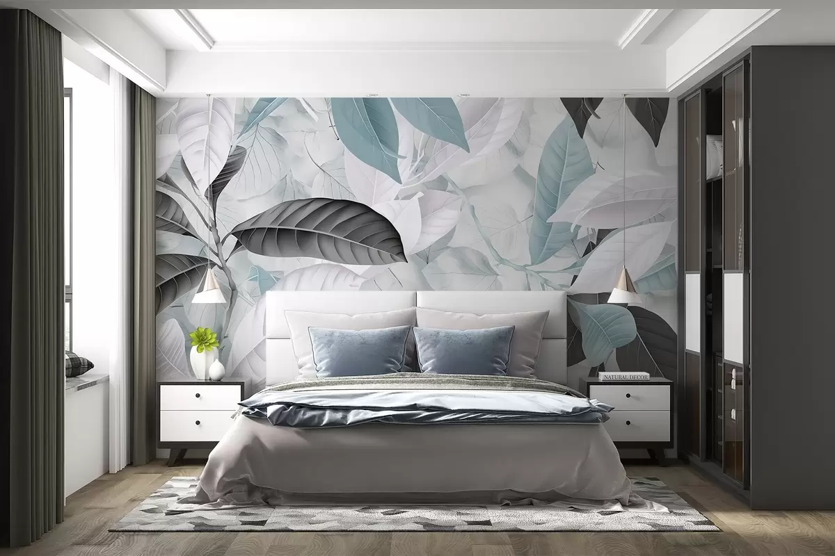 Fotobehang Grote print van blauwe en grijze bladeren tegen een achtergrond met lichte bladerenstructuur, waardoor een weelderig tropisch gevoel ontstaat N° w08468v1