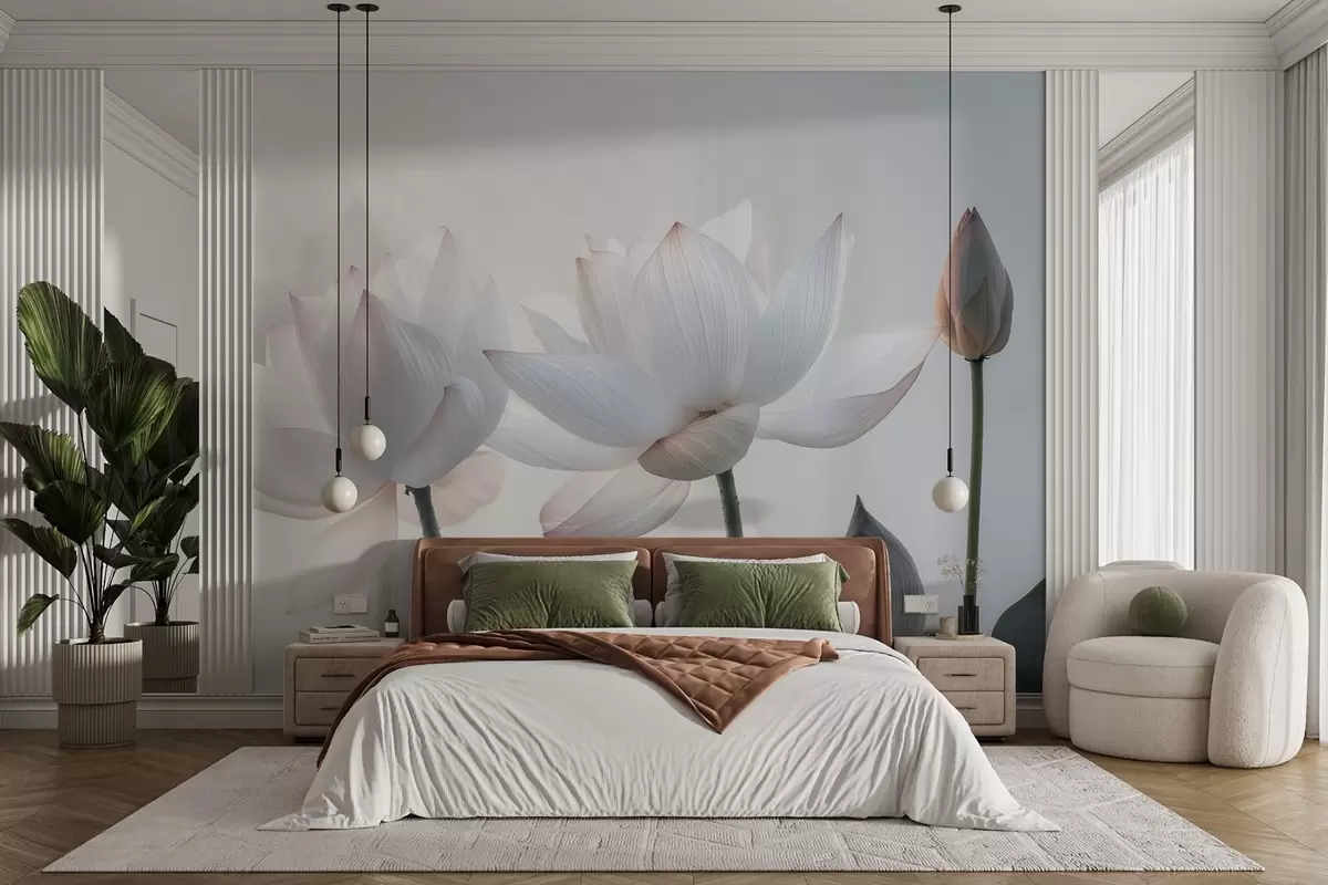 Fotobehang Zachte lotusbloemen met bloemblaadjes en bladeren N° w08488