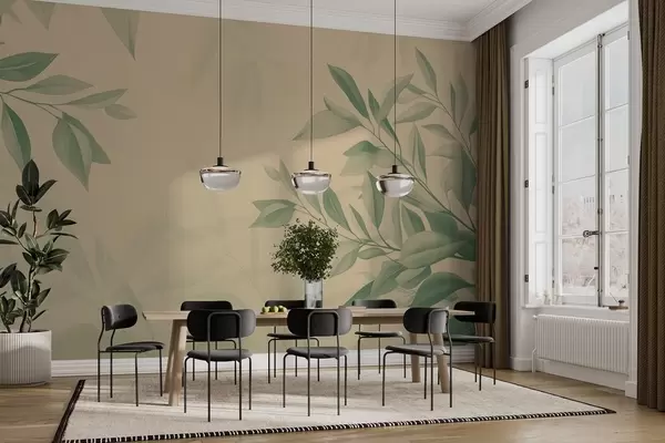 Fotobehang Groene bladeren met een zachte warmbeige achtergrond N° w08499v2