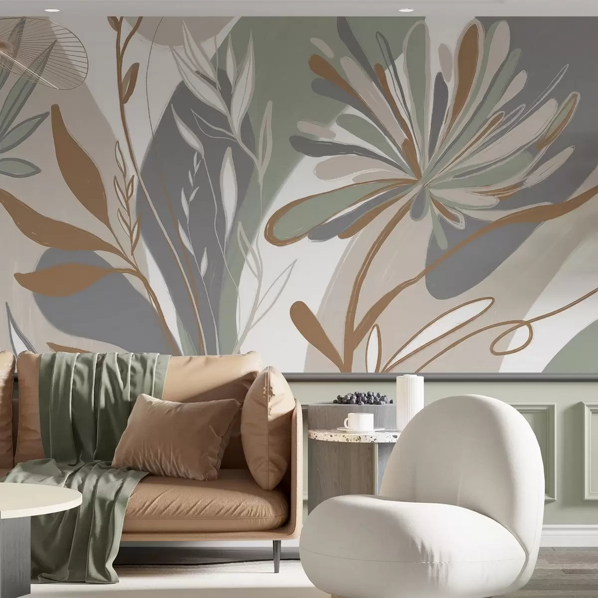 Fotobehang Abstracte minimalistische bloemenprint met gestileerde bladeren en bloemblaadjes in groen-, grijs- en beigetinten N° w08536