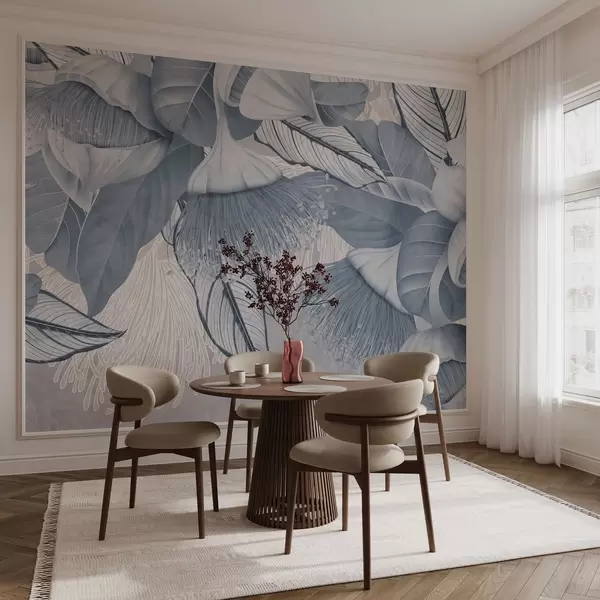 Fotobehang Botanische illustratie van grote, blauwe eucaliptusbloemen met lange meeldraden tegen een grijze en witte achtergrond N° w08539v1