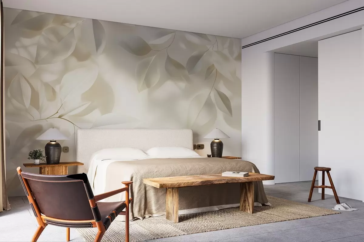 Fotobehang Hangende witte takken met bladeren tegen een muur met zonlicht N° w08552