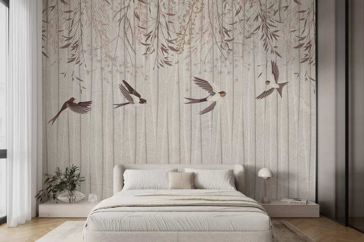 Fotobehang Vliegende vogels op een gestructureerde achtergrond met paardenbloemen en bloemen N° w08566