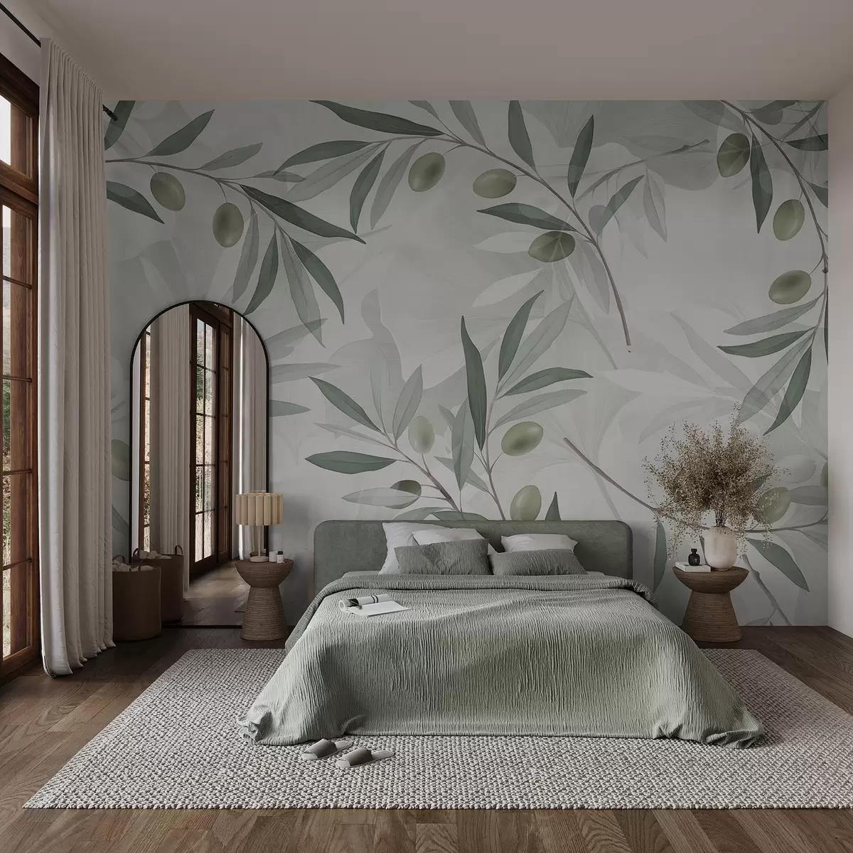 Fotobehang Olijftakken met groene bladeren en olijven op een lichte achtergrond N° w08576