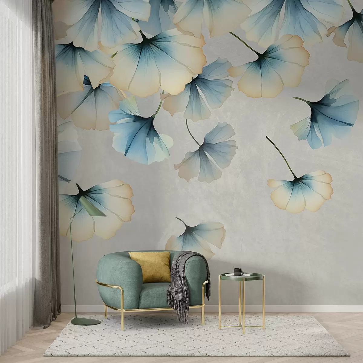 Fotobehang Pastelkleurige blauwe en gele ginkgobladeren met delicate bloemblaadjes die in de lucht zweven tegen een texturale achtergrond N° w08578v1