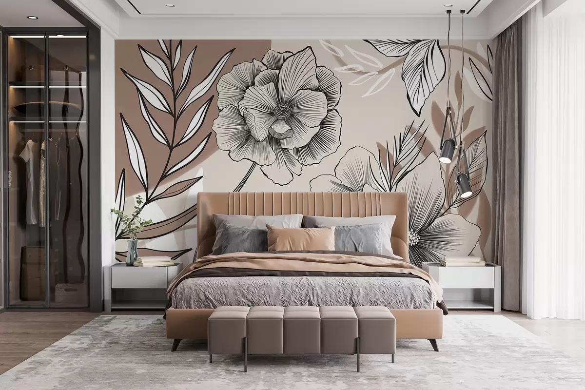 Fotobehang Grote zwart-witte grafische bloemen met gedetailleerde bladeren op een beige abstracte achtergrond N° w08580