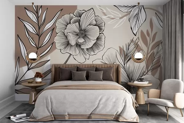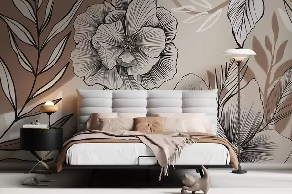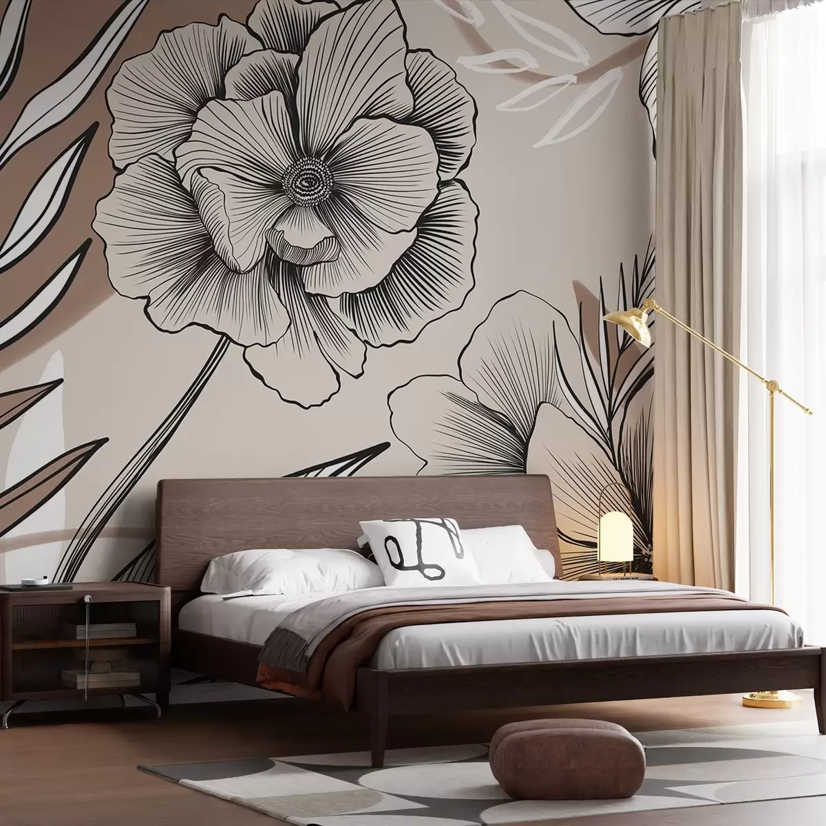 Fotobehang Grote zwart-witte grafische bloemen met gedetailleerde bladeren op een beige abstracte achtergrond N° w08580