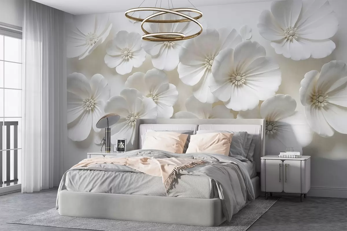 Fotobehang Witte bloemen met fijne bloemblaadjes en hartjes tegen een lichte achtergrond N° w08587