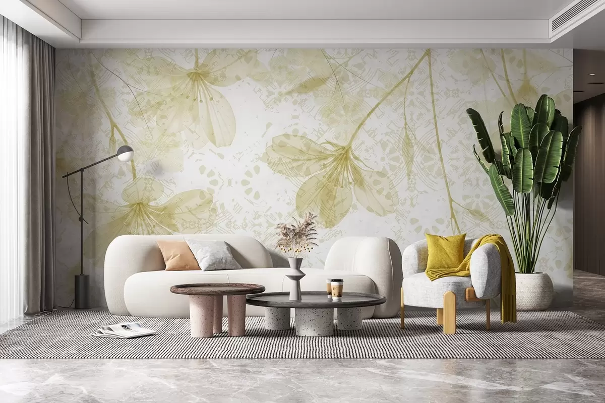 Fotobehang Delicate gele en witte bloemen met lange stelen en bloemblaadjes tegen een zachte, onscherpe textuurachtergrond N° w08588v2