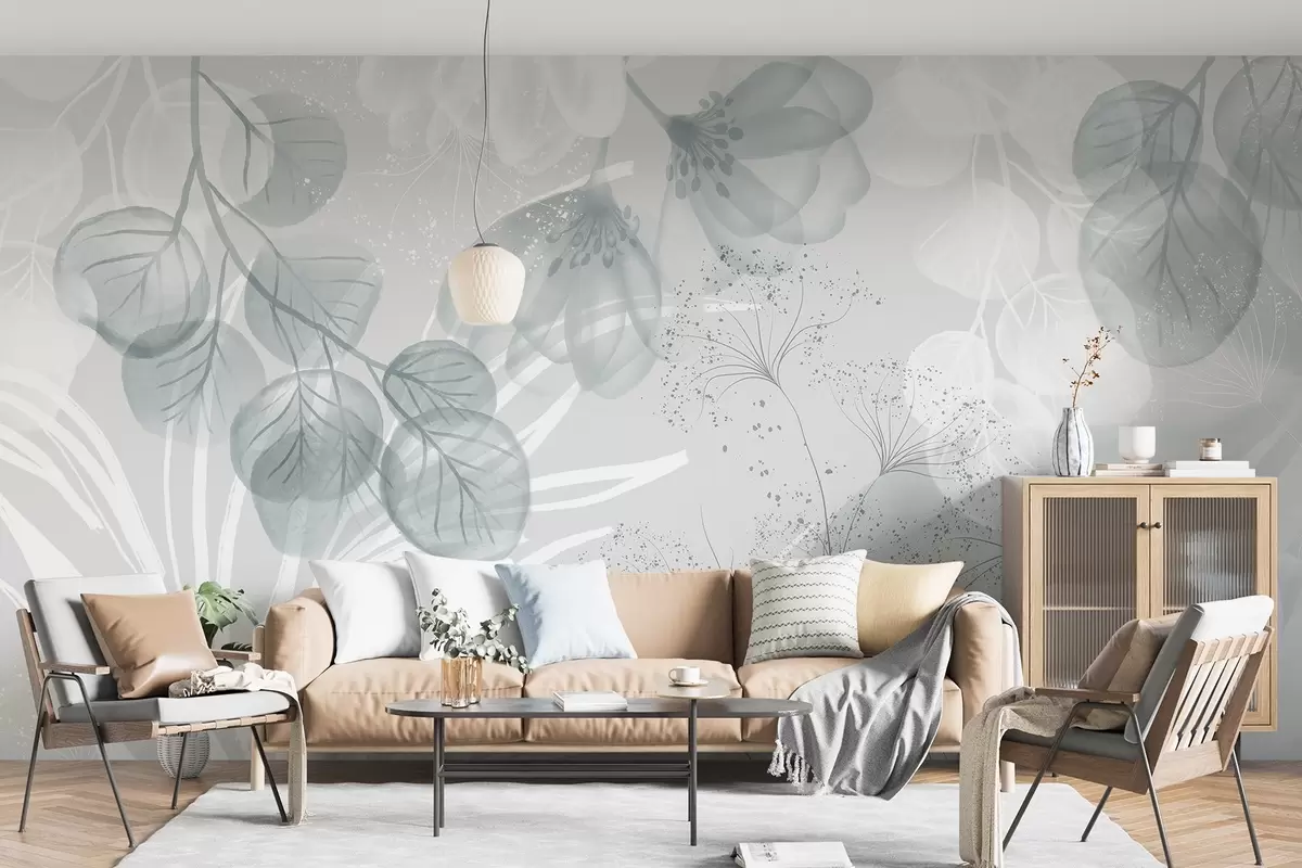 Fotobehang Florale eucaliptuselementen in blauw- en wittinten met overlappende bladeren en bloemblaadjes in een minimalistische stijl N° w08599