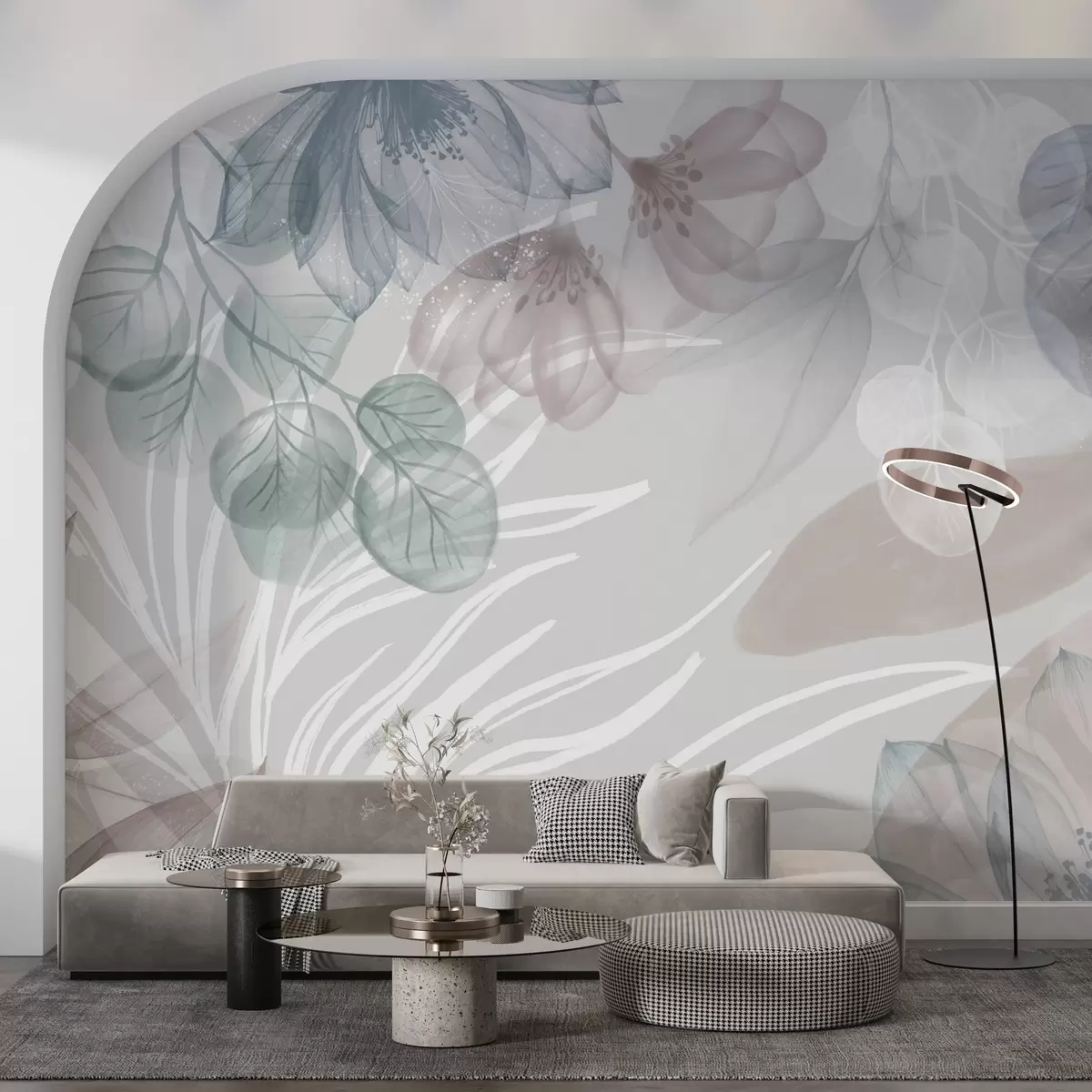 Fotobehang Pastelkleurige bloemenprint met transparante grote abstracte bloemen en bladeren in grijstinten, roze en groen N° w08600