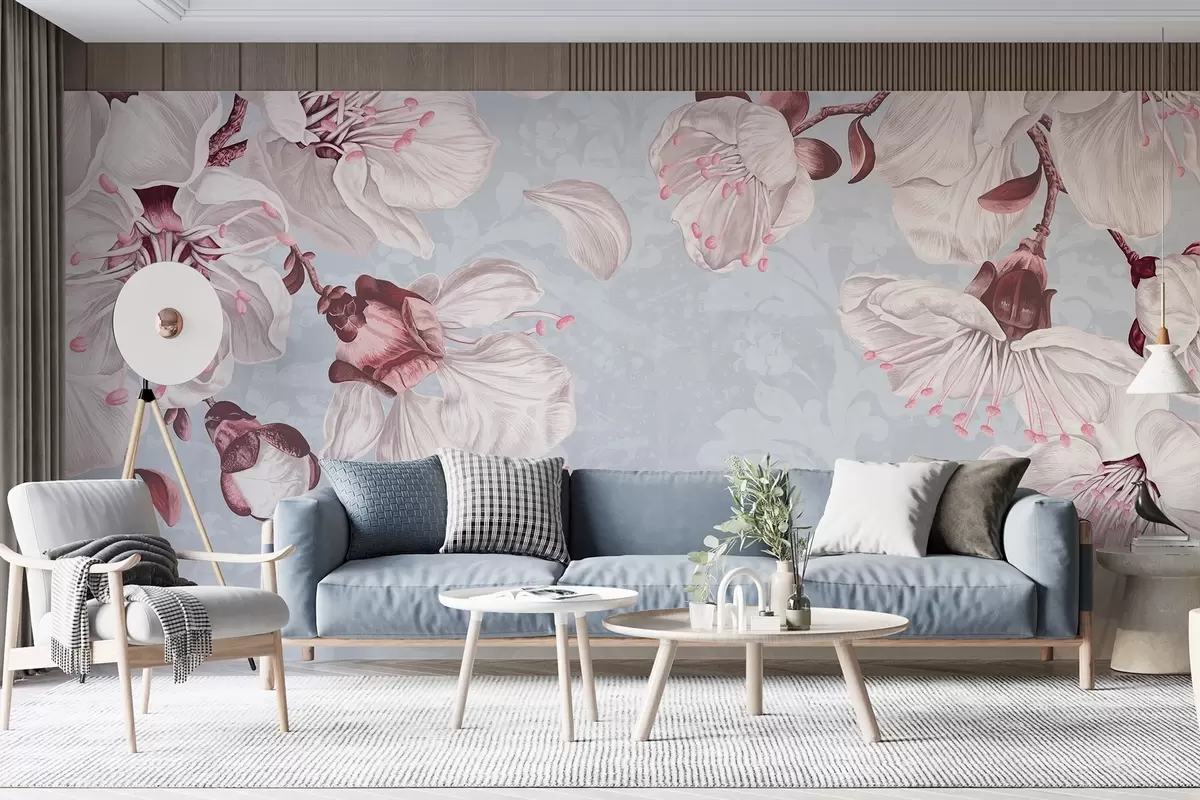 Fotobehang Een bloemenprint met grote roze en witte kersenbloeiende bloemen tegen een lichtblauwe textuurachtergrond N° w08601