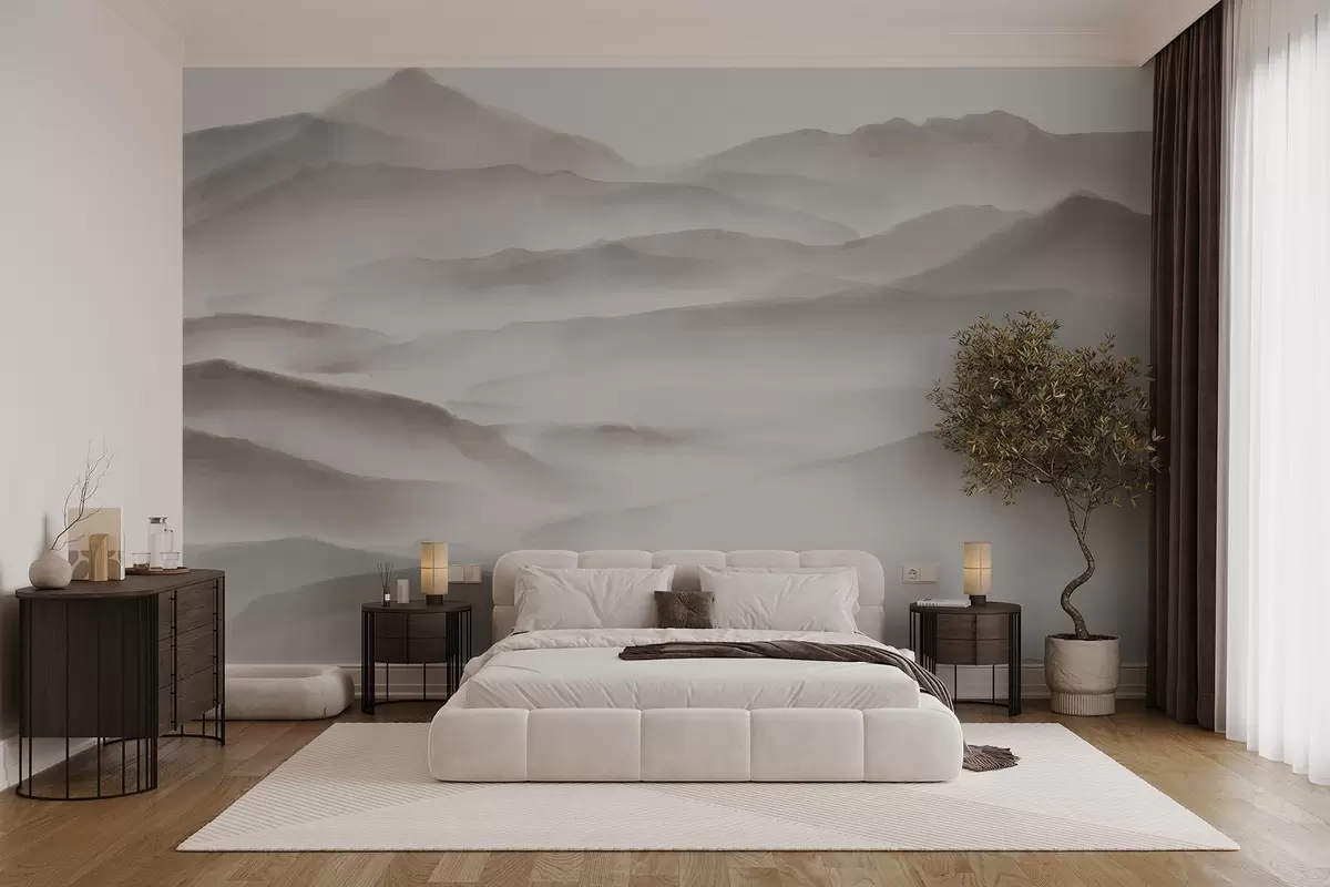 Fotobehang Minimalistisch berglandschap met glooiende heuvels en mist, waardoor een serene en sfeervolle print ontstaat N° w08602