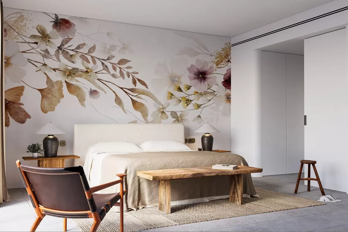Fotobehang Bloemstuk met zachte, gedempte kleuren met beige en witte bloemen en bladeren tegen een lichte achtergrond N° w08603
