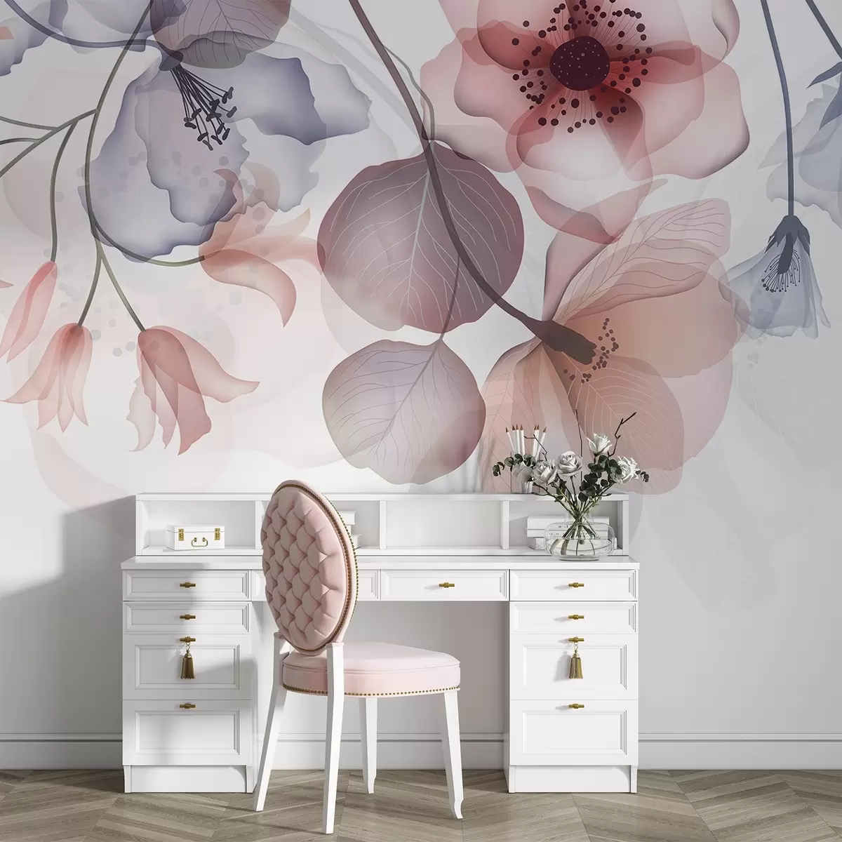 Fotobehang Delicate roze en grijze doorschijnende bloemen met zachte bloemblaadjes en donkere harten, tegen een lichte achtergrond N° w08613