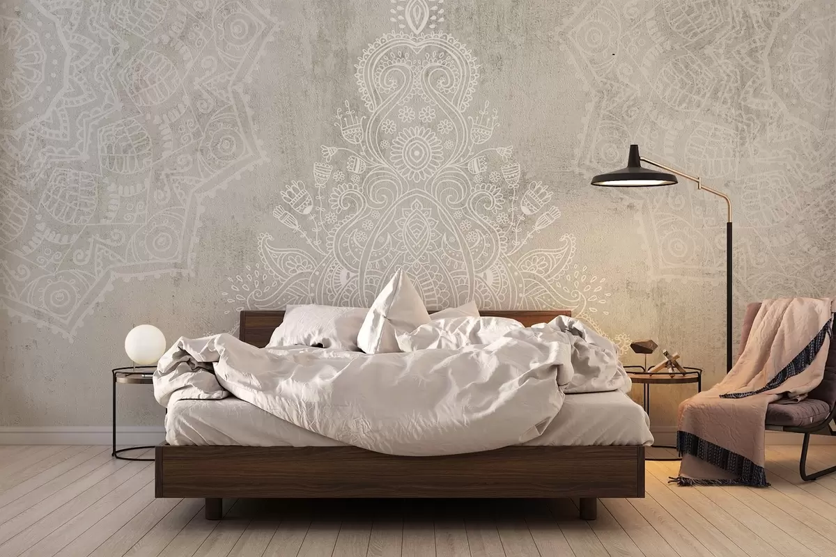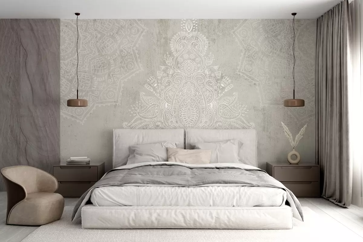 Fotobehang Een gedetailleerde, ingewikkelde mandalaprint van wit kant op een lichtbeige abstracte achtergrond met structuur N° w08614