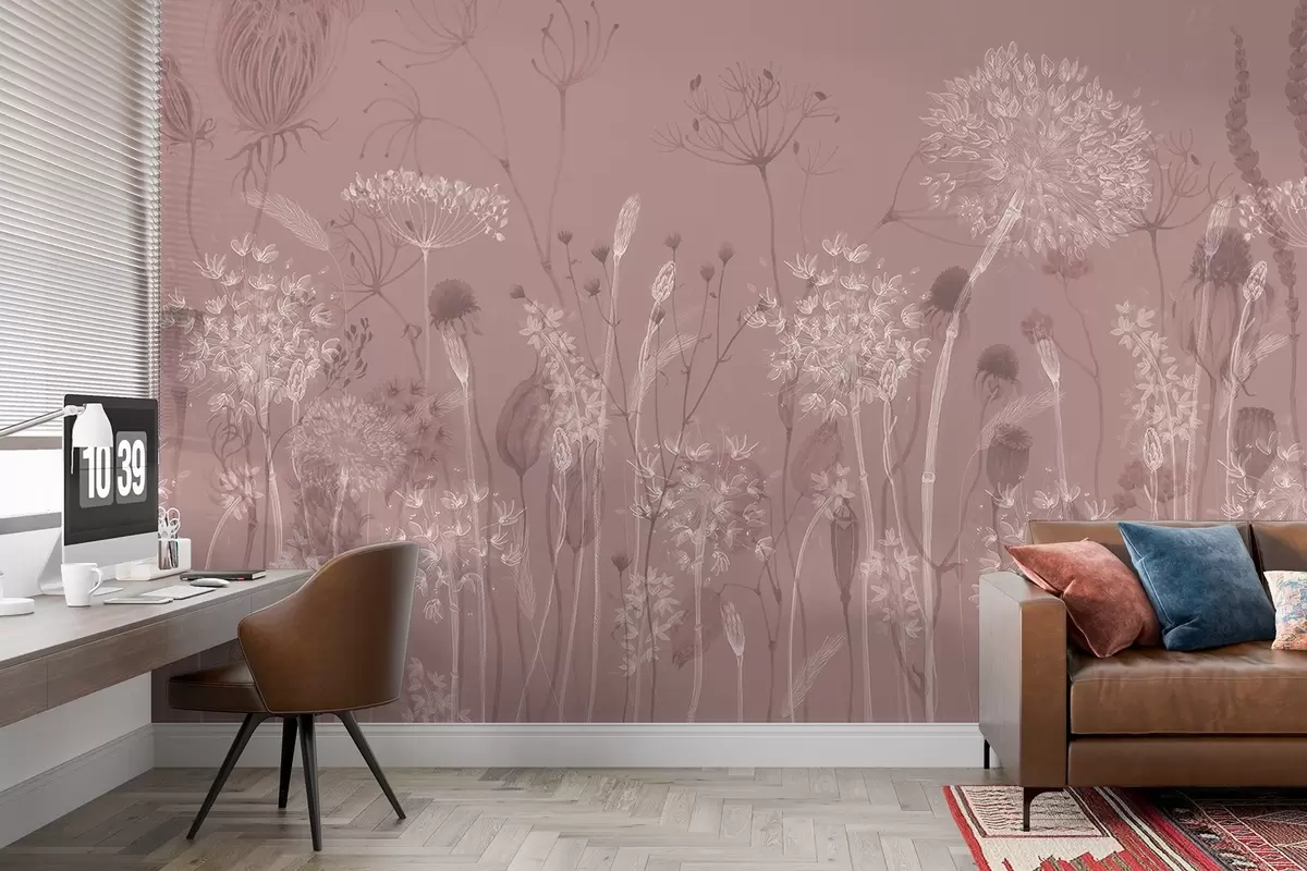 Fotobehang Luchtige paardenbloemen en wilde bloemen in aquarelstijl in roze tinten N° w08637v1